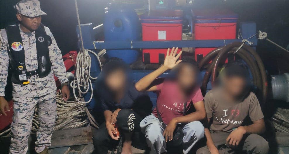 Ketiga-tiga suspek berusia dalam lingkungan umur 32 hingga 40 tahun itu ditahan bersama bot sebelum dibawa ke Jeti Maritim Bukit Malut untuk siasatan lanjut.
