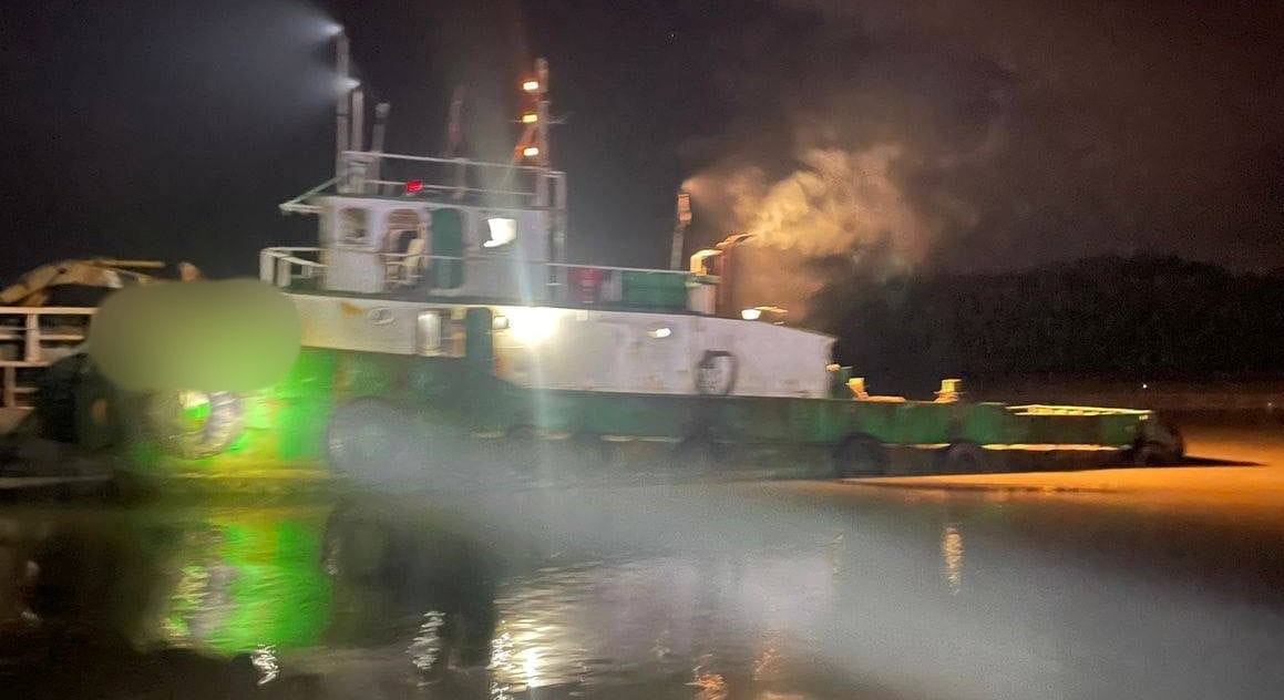 Kru dan bot tunda ditahan sebelum diiring masuk ke jeti Kompleks Maritim Tun Abang Salahuddin (KOMTAS) Muara Tebas untuk siasatan lanjut.