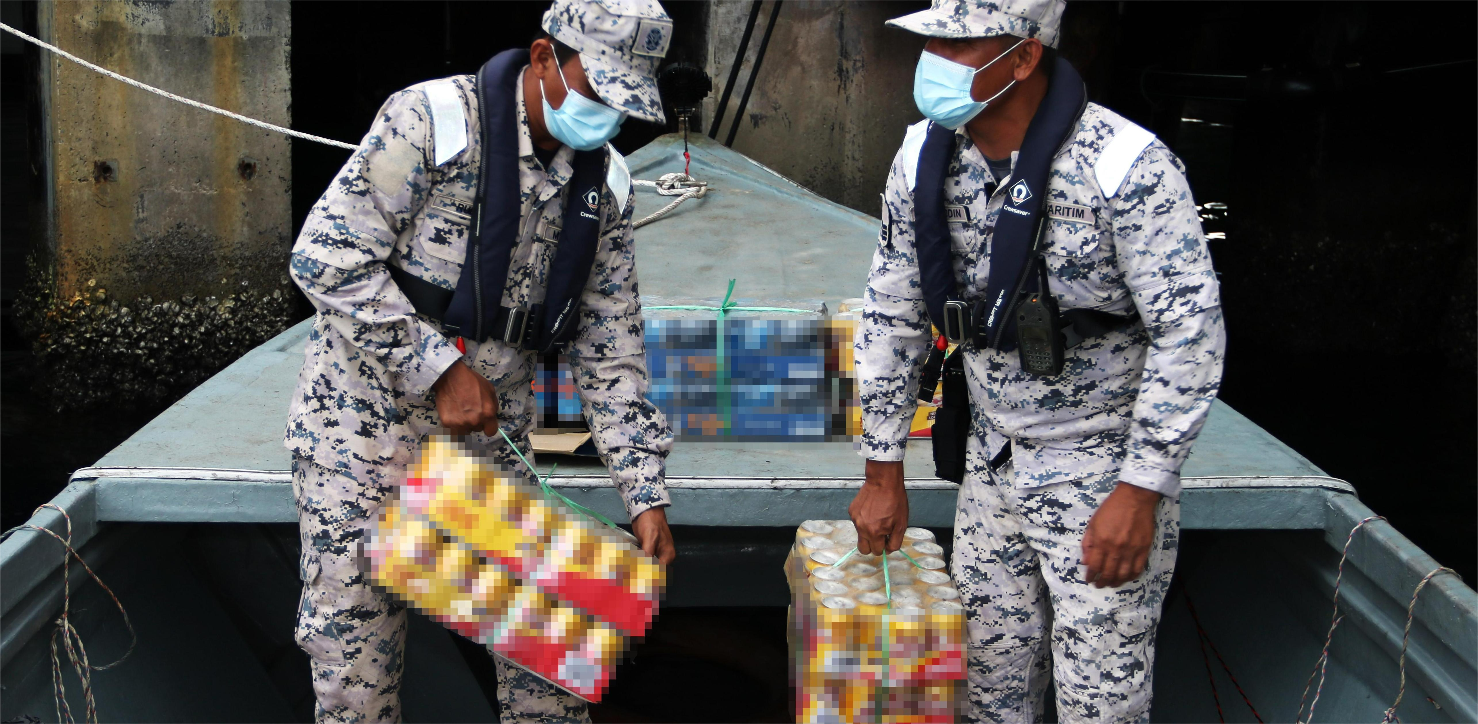 LABUAN, 25 APRIL - Atas maklumat risikan, minuman keras pelbagai jenama beserta sebuah bot pancung fiber dan tiga buah enjin yang dianggarkan bernilai lebih RM472 ribu telah dirampas Zon Maritim Labuan ketika cuba diseludup keluar dari Pulau Labuan di kedudukan 2.9 batu nautika timur laut Pulau Balangkasan, Menumbok sekitar jam 5.10 pagi tadi.