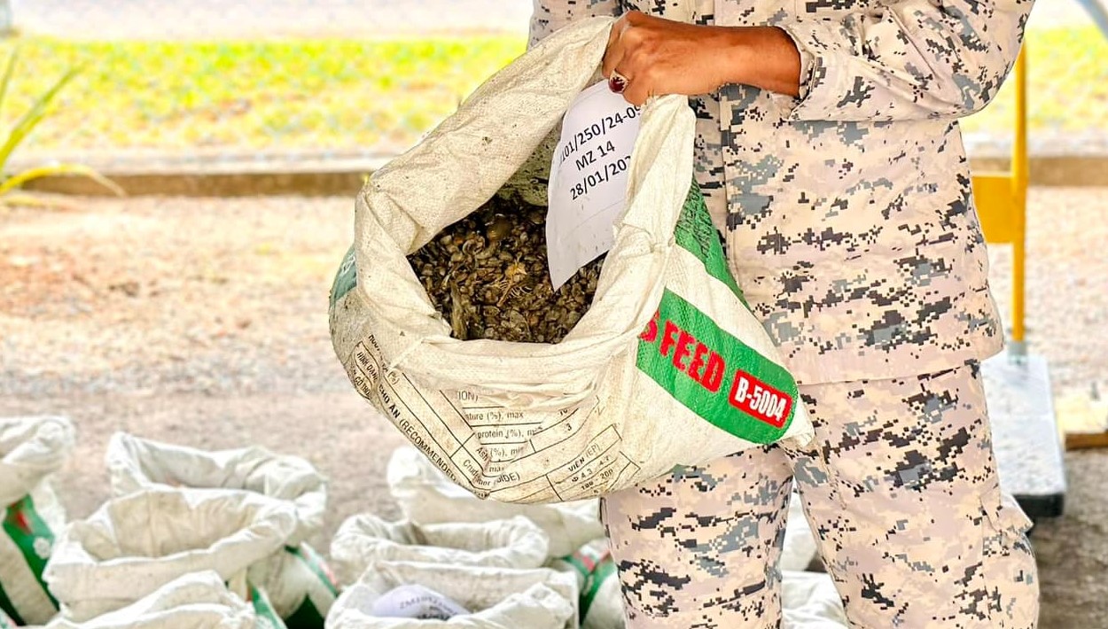 Setibanya di lokasi, seorang suspek bersama sebuah bot didapati berjaya melarikan diri dan meninggalkan 37 guni berisi benih kerang dan dianggarkan 30 kilogram setiap guni.